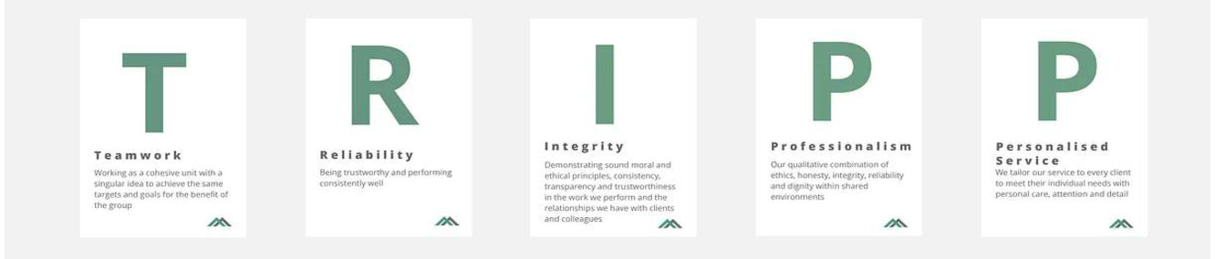 Our Core Values includes Teamwork, Reliability, Integrity, Professionalism, and Personalised Services
